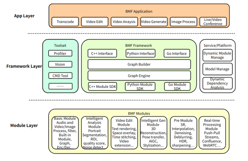 BMF(Babit Media Framework)框架是⼀个不错的选择,它继承了 FFmpeg 的强⼤功能,同时模块编写⽀持多语⾔(C++,Python,Go)的特性使其可以轻松接⼊ AI 能⼒,灵活的 pipeline+ 模块化设计也使得其易于扩展和定制。